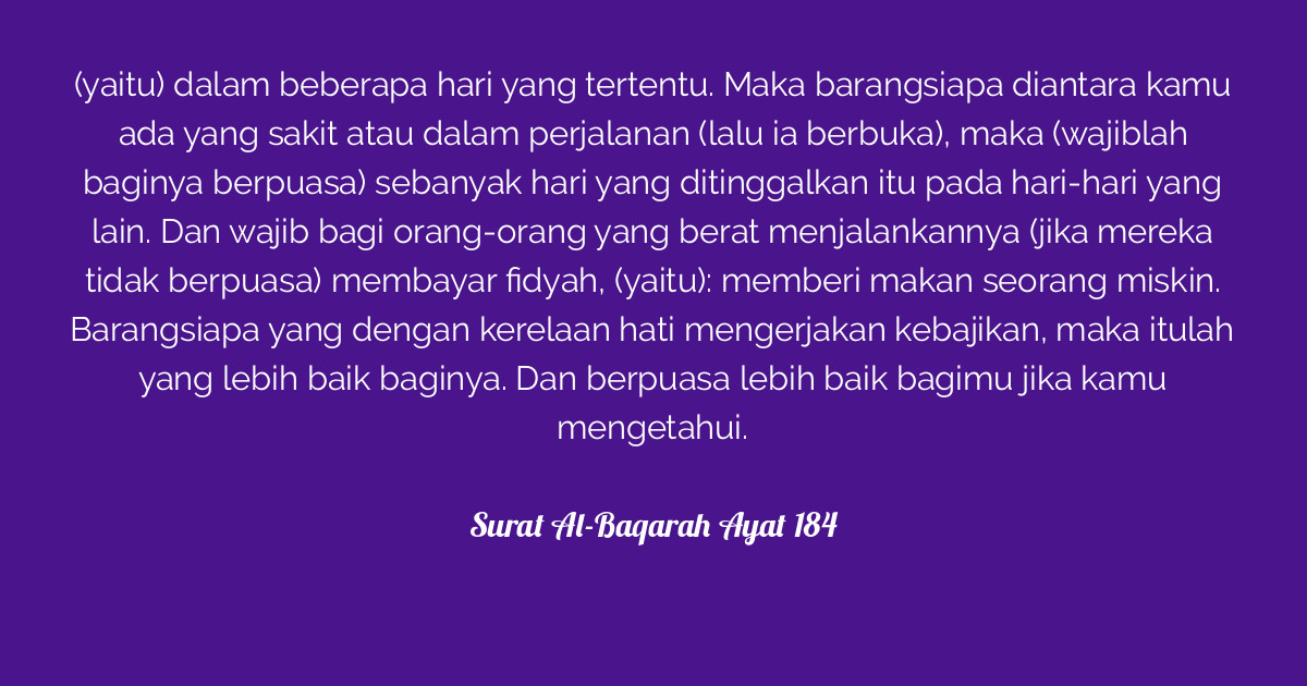 Ada beberapa orang yang mendapat keringan untuk tidak berpuasa. Jika allah menyatakan dalam ayat sebelumnya bahwa diwajibkan berpuasa bagi orang yang beriman pada ayat ini dinyatakan bahwa pelaksanaan puasa yang diwajibkan itu bukanlah pada semua hari sepanjang tahun. ف م ن ك ان م نك م م ر يض ا أ و ع ل ى س ف ر ف ع د ة م ن أ ي ام أ خ ر barang siapa di antara kalian ada yang sakit atau dalam perjalanan lalu ia berbuka maka ia wajib mengganti sejumlah hari yang ia tinggalkan pada hari hari lain al baqarah. Allah subhanahu wa ta ala telah mewajibkan shaum ramadhan atas setiap muslim yang telah memenuhi syarat wajib puasa.